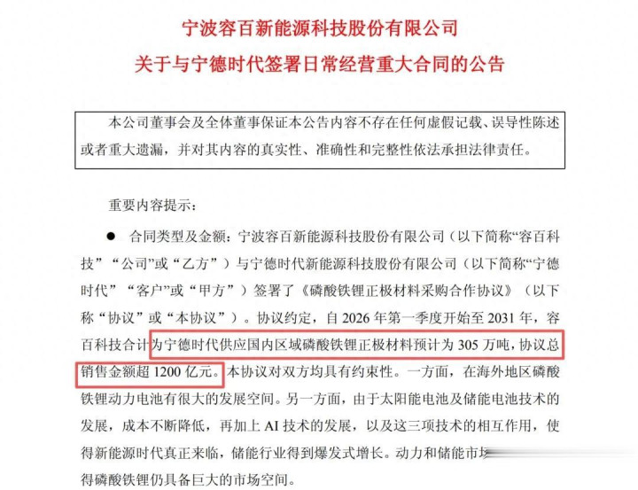 1月13日,容百科技发布公告称,与宁德时代签署了《磷酸铁锂正极材料采购合作协议》,协议约定,自2026年第一季度开始至2031年,容百科技合计为宁德时代供应国内区域磷酸铁锂正极材料预计为305万吨,协议总销售金额超1200亿元。且本协议对双方均具有约束性。